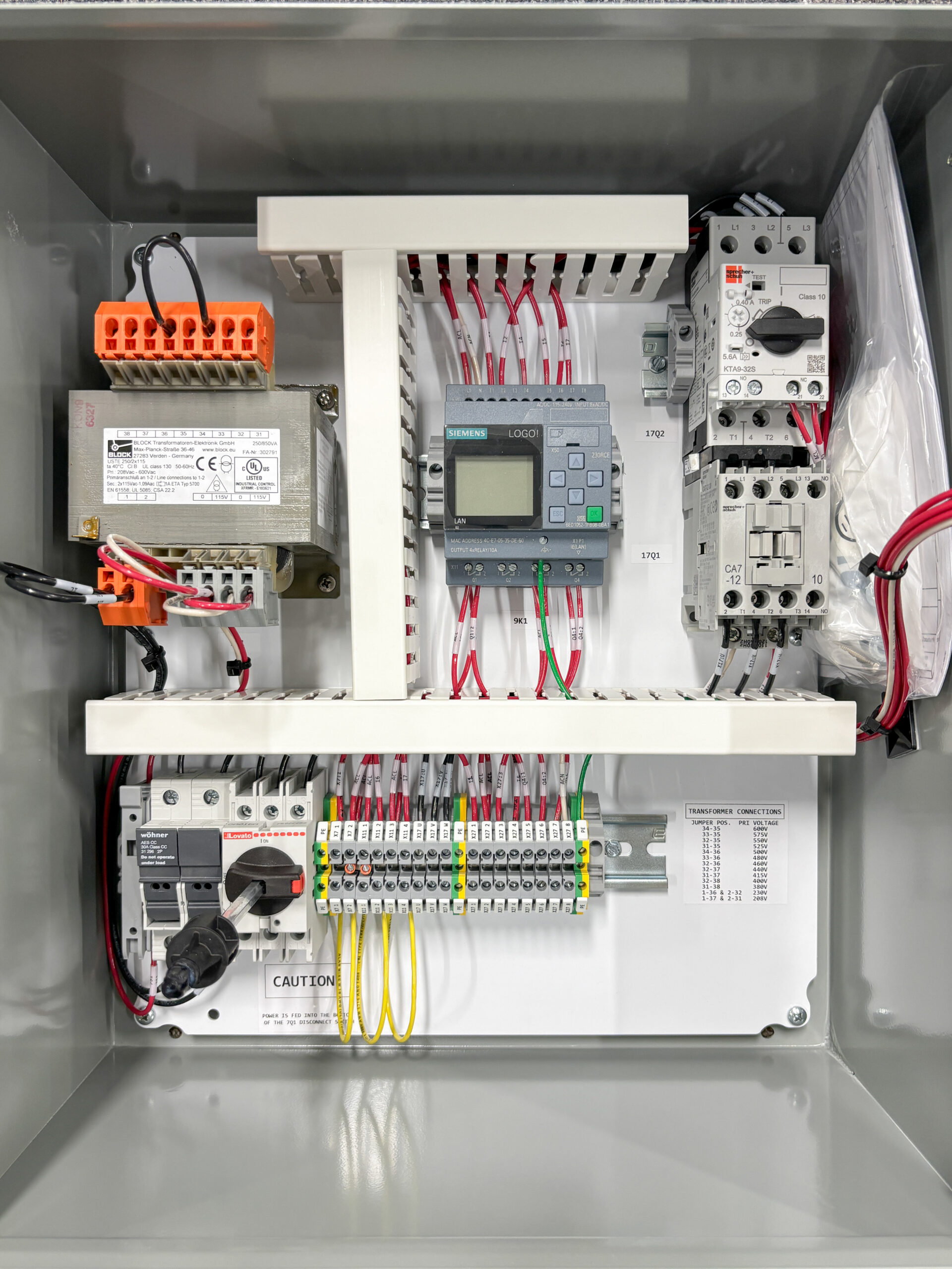 It is densely populated with PLC I/O modules from Unitronics. It includes interface relays for all external equipment and an industrial cell modem to allow remote monitoring and control.