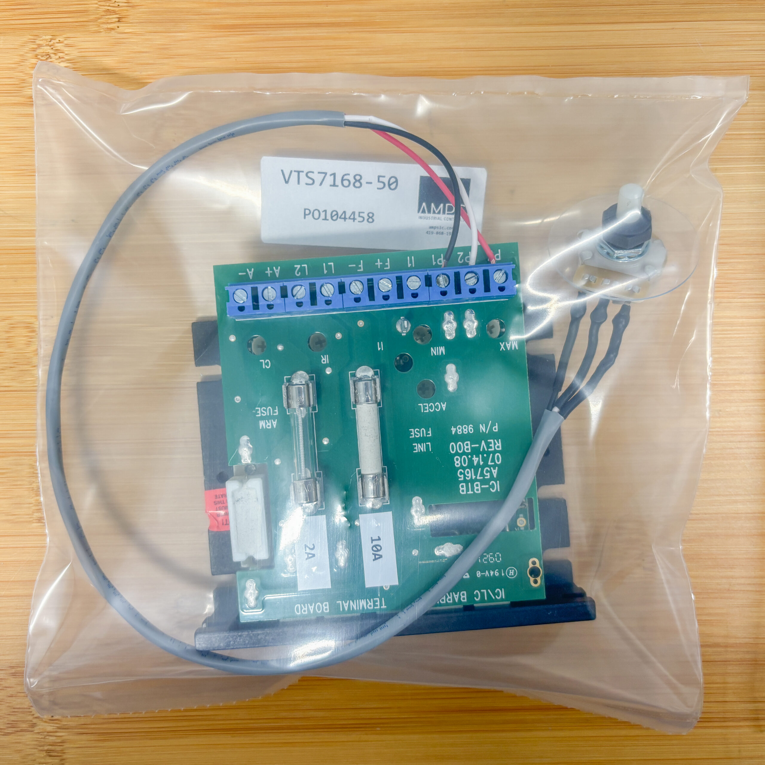 This bag contains a simple engineered solution; where we solder a custom cable to a speed potentiometer, wire it to a DC motor control, add custom labeling, and package the assembly inside a heat-sealed bag with the customer’s part number.